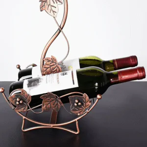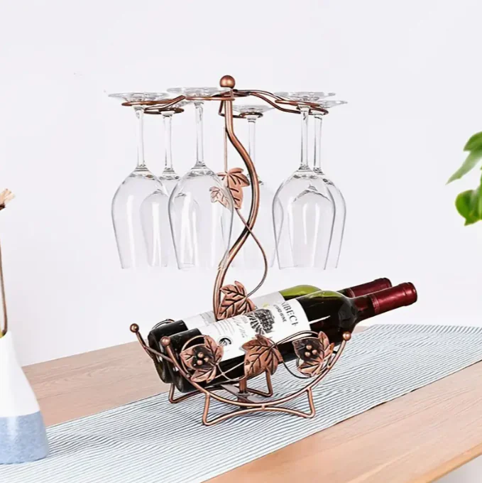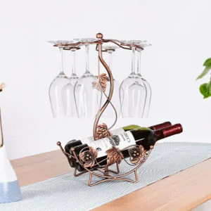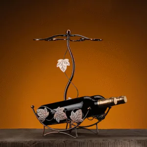 Crafted from polished iron, it holds 2 wine bottles and 6 glasses, making it both functional and decorative… perfect for your wine cabinet, kitchen, or bar decor.