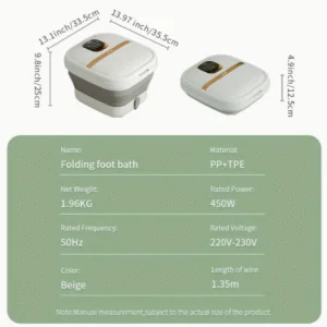 Transform your home into a personal spa with the Collapsible Electric Foot Spa. Featuring relaxing massage rollers, quiet operation, and integrated lighting, it’s designed to relieve stress and soothe tired feet. Powered by a 220V-230V supply with a British plug, this compact footbath is the perfect companion for relaxation and wellness at home.