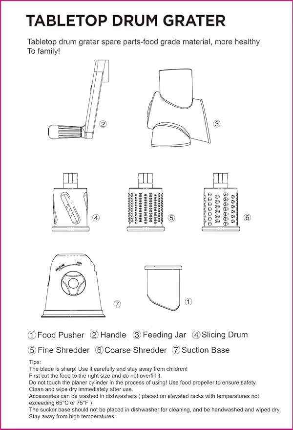- Blades: 3 rotary drum blades (slice, shred, grate)