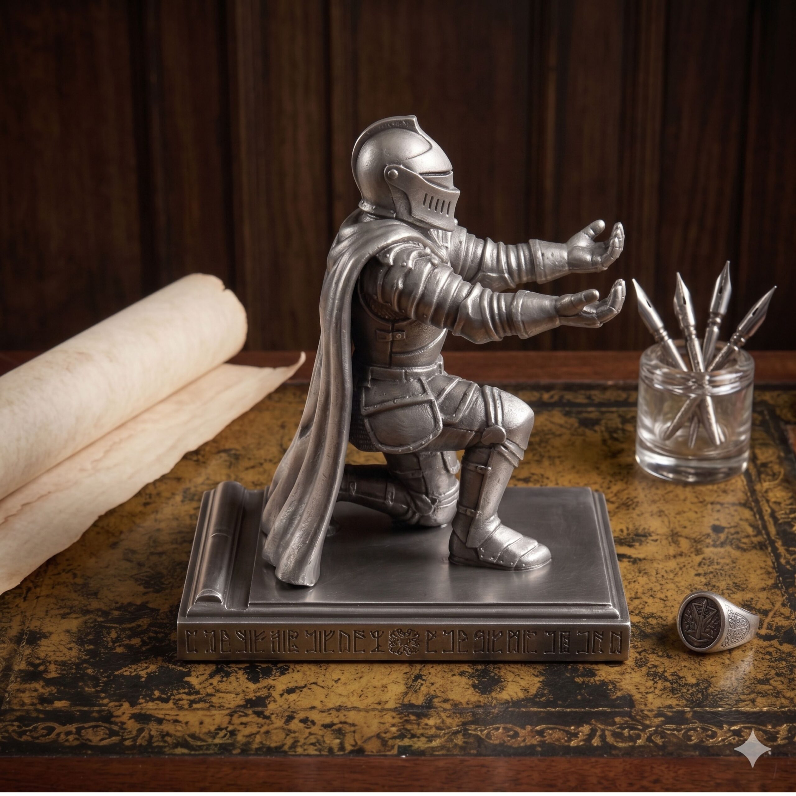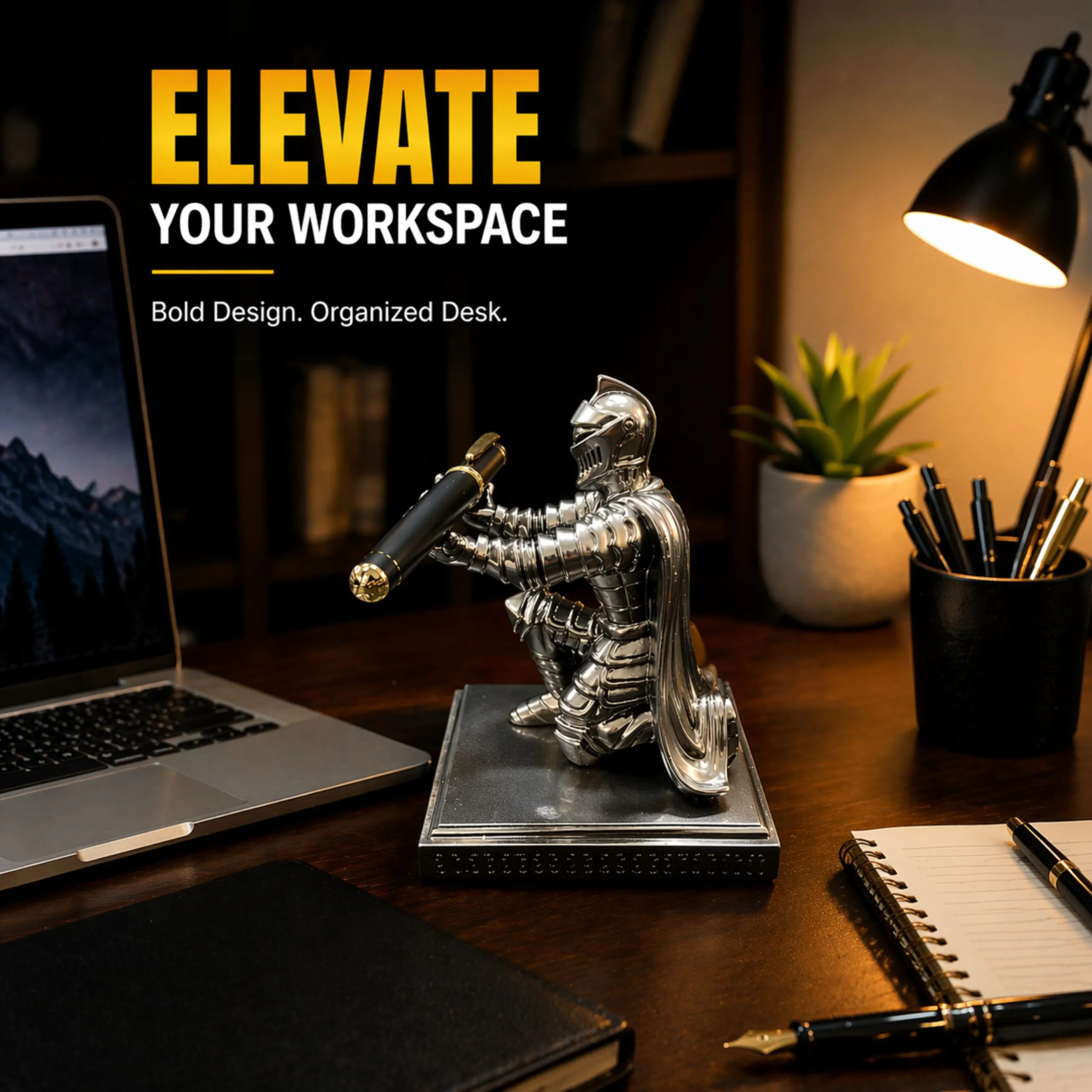 Add a bold touch of elegance to your workspace with this uniquely designed knight-themed desk organizer. Crafted with attention to detail, this premium piece combines functionality with a striking medieval aesthetic. Whether you are organizing your essentials or upgrading your desk decor, this holder makes a powerful statement.