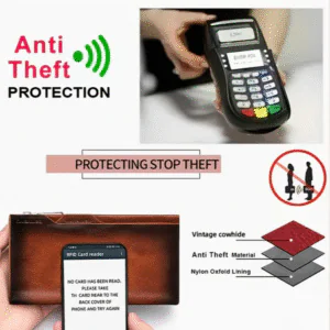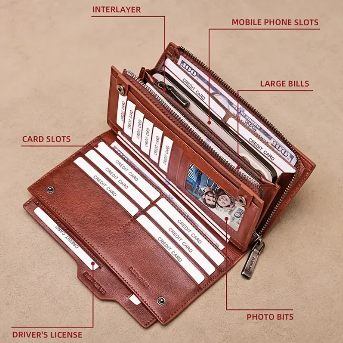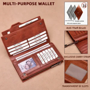 Upgrade your everyday carry with this Premium Cowhide Leather Wallet, crafted for durability, security, and timeless style. Featuring built-in RFID-blocking technology, it protects your cards from unauthorized scanning, keeping your data safe at all times. The spacious interior includes multiple card slots, a zippered coin pocket, and organized compartments for cash and essentials. Finished with a smooth zipper and elegant stitching, this wallet combines luxury with practicality — perfect for men and women who prefer classic charm with modern security.